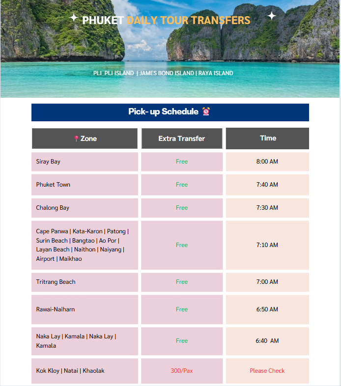 | 10:30 | 🌊 Depart from pier to Phi Phi Island |